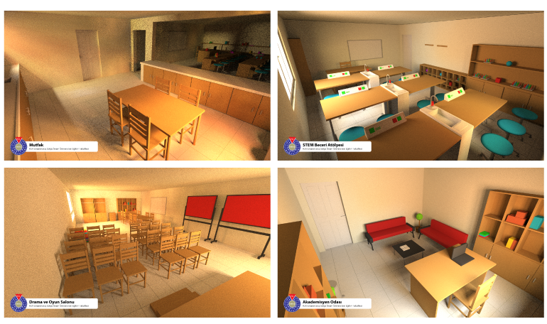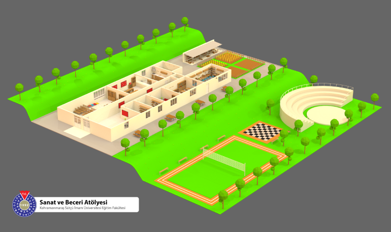 Within the KSU Arts and Skills Centre; academician rooms, STEM laboratories, volleyball, chess and open air theatre areas, kitchen, first aid and material teaching areas, drama and games room, repair and skills workshop and garden workshop were designed and modelled in 3D. In this project, KSU Faculty of Education management and academicians worked together.